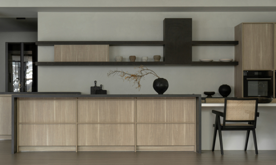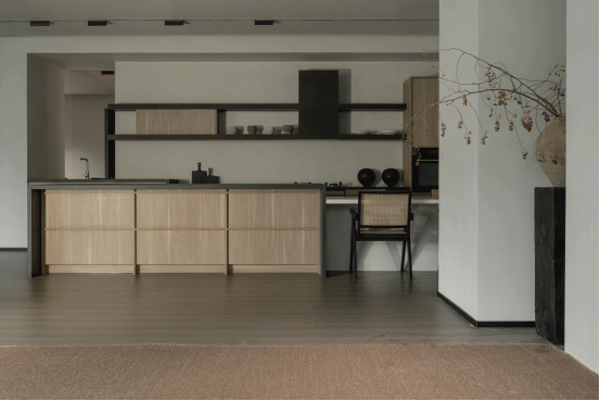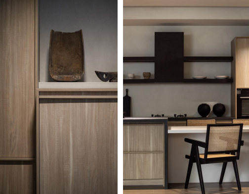 骨骼线形态设计,将柜门设计分为地柜、高柜,以反复的比例推敲、线条的去芜存菁,透过线条间彼此支撑的力量感,沉淀柜体脉络自然延伸的平衡之美。