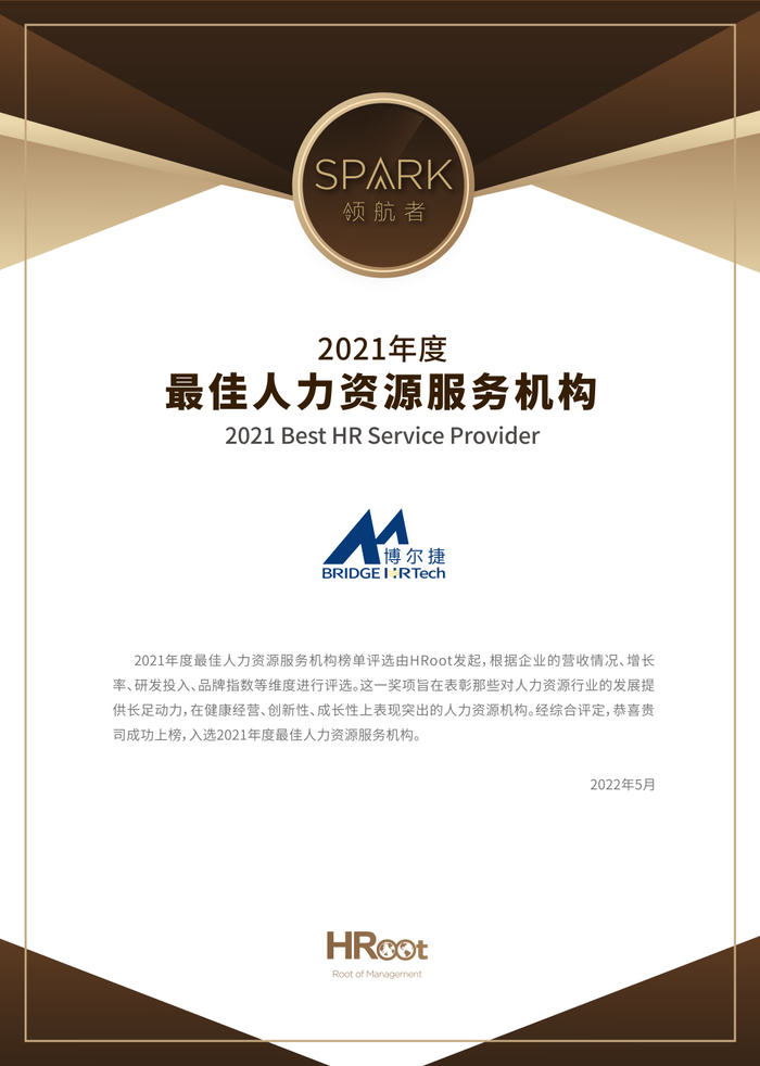 喜报!博尔捷数字科技荣获HRoot「Spark领航者」 2021年度最佳人力资源服务机构