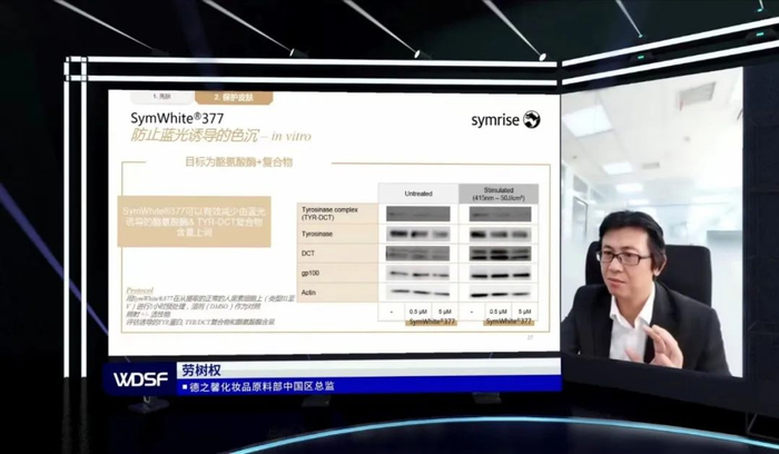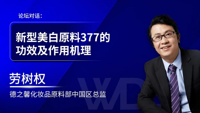 德之馨化妆品原料部中国区总监劳树权带来《新型美白原料377的功效及作用机理》的主题演讲,从新型美白原料377入手,探寻下一个“377”出口。