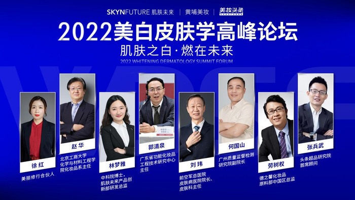 作为SKYNFUTURE肌肤未来首届美白学术盛宴,2022美白皮肤学高峰论坛集结了美丽修行合伙人徐红,北京工商大学化学与材料工程学院化妆品系主任赵华,中科院博士、肌肤未来产品创新部研发总监林梦雅,广东省功能化妆品工程技术研究中心主任郭清泉,前空军总医院皮肤病医院院长、皮肤科主任、中国医师协会皮肤科医师分会顾问刘玮,广州质量监督检测研究院副院长、国家化妆品质量检验检测中心副主任何国山,德之馨化妆品原料部中国区总监劳树权,头条超品研究院首席顾问张兵武八位权威专家“云巅”对话。
