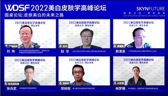 2022美白皮肤学高峰论坛圆桌对话,也请到了刘玮、赵华、郭清泉、张兵武、劳树权、林梦雅五位权威专家,一起从前沿技术到行业应用,探索皮肤美白的未来之路。