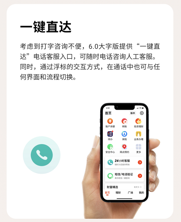 同时,口袋银行6.0版本还格外关注老年人等需要特殊关爱的用户群体。一个细节设计是,老年用户第一次进入6.0常规版本后就会收到提示,告知有大字版本可供选用,而不需要像过去那样进入设置界面手动进行版本切换。同时,新版本还为老年用户隐藏了大部分他们使用频次较低的功能和服务,比如贷款等,让App中的服务内容更为聚焦。