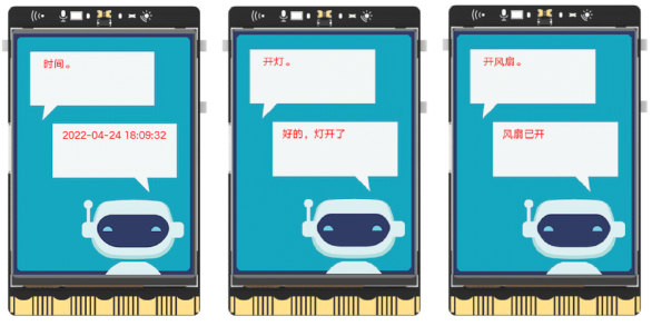 具体功能和操作如下,首先,将LED灯、风扇外接到行空版上,之后给行空板配置网络,接着编写并运行程序,在行空版屏幕上显示背景图和初始信息后,按下板载按键录制语音,等待行空板依据程序自动将语音上传至百度语音平台并返回得到语音对应的文字内容,随后对文字内容进行判别,当其中有“时间”两个字时,自动检测系统的时间并更新显示在行空板的屏幕上,而当文字内容中有“开灯”、“关灯”、“开风扇”、“关风扇”、“开闹钟”、“关闹钟”等信息时,行空板控制LED等、风扇、板载蜂鸣器执行相应的操作。
