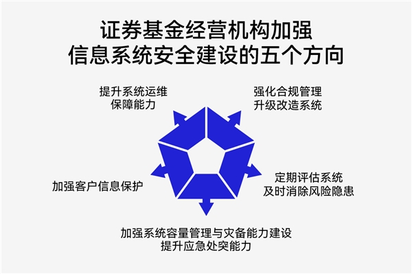 针对上述问题,证监会还要求证券基金经营机构从五个方向加强信息系统安全建设,维护好投资者合法权益——提升系统运维保障能力;强化合规管理,升级改造系统;定期评估系统,及时消除风险隐患;加强客户信息保护;加强系统容量管理与灾备能力建设,提升应急处突能力。