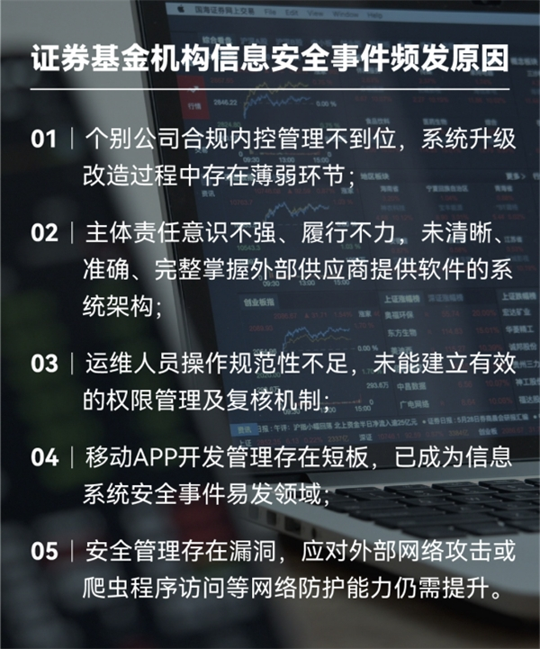 除了交易系统技术层面的原因,人的原因更加不容忽视。针对近一年来证券基金机构信息安全事件频发,在5月19日下发的2022年第5期《机构监管情况通报》中,证监会指出了五个主要原因: