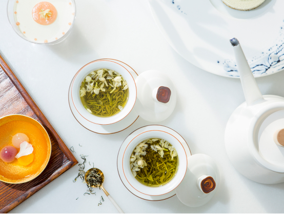 茉莉花荼——将茶叶和茉莉鲜花进行拼和、窨制,使茶叶吸收花香制成的茶,茶香与茉莉花香融合转化,素有“人间第一香”的美誉。在北国,茉莉花茶被称作国饮,无论是文人雅士还是市井贩夫都爱来一碗,又有无所不包的文化气象。于是,一碗茉莉花茶也有了高下之分,而其中极品则是被称作“风雅高洁之饮”的碧潭飘雪。