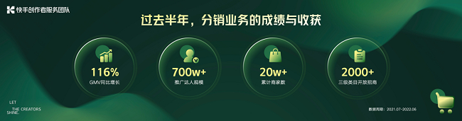 今年上半年同比2021年上半年,快分销GMV同比增长116%,推广达人规模达到700万,累计准入商家超20万,2000+个三级类目开放招商。