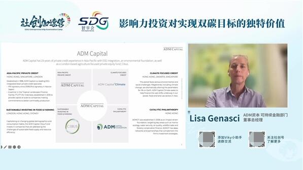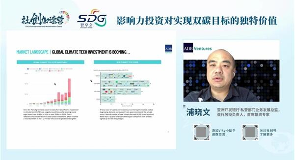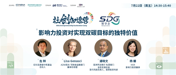 2022年7月,由社会价值投资联盟、深圳市绿色金融协会主办,浦发银行深圳分行、前海国际人才港协作的社创加速营顺利举办“影响力投资对实现双碳目标的独特价值”主题分享活动,邀请红杉远景碳中和基金合伙人左林,ADM资本可持续金融部门董事总经理Lisa Genasci,亚洲开发银行私营部门业务发展总监、亚行风投负责人、首席投资专家浦晓文,KKR影响力投资董事杨姗,分享国内外碳中和基金的现状及未来趋势展望,以及国内外影响力投资在双碳领域实践,并于网易新闻广东创投频道、中国基金报、36氪旗下36碳、经济观察报、凤凰龙行等媒体平台同步线上直播。