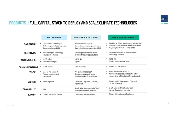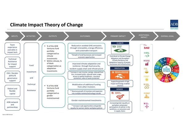亚行风投在做一期基金投资的时候,也是先思考到底要通过怎么样的投资策略来达成目标的气候变化影响力。为此亚行风投分析了温室气体排放最多的行业,针对这些行业的革新技术进行投资。在对单项技术投资后,会设定一个气候变化影响力目标,也就是这项技术最终在全球范围内广泛应用后,可以达到的碳减排前景有多大。在这个过程中亚行风投也设计了一个目标卡片来评测每个项目在气候变化上产生的影响力,当影响力不符合预期时对其进行修正或升级,最终达成影响力目标。