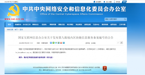最振奋人心的是,7月25日,国家互联网信息办公室根据《区块链信息服务管理规定》,发布第九批共348个境内区块链信息服务名称及备案编号。数藏九州赫然在列,序号15,备案号是京网信备11011422578297290024号。