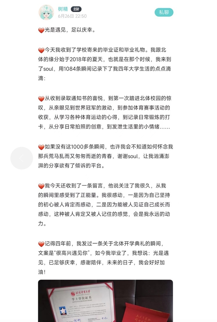 “光是遇见,已足够庆幸。感谢陪伴,未来的日子,我会好好加油。”收到学校北京体育大学寄来的毕业证和毕业礼物,@树精在社交平台Soul App上发布了一条瞬间。
