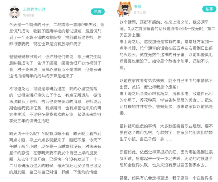 回想备考的那些时光,面对巨大的压力,@上岸的羊小咩每天疯狂地发仅自己可见的“朋友圈”,通过自己与自己对话,舒缓焦灼的情绪。现在,她对未来充满期待,学习自己喜欢的专业,享受自己选择的生活,那些日日夜夜的奋斗都是值得的。