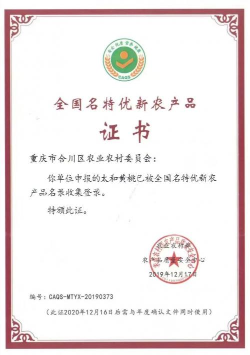 2019年12月,太和黄桃被纳入全国名特优新农产品名录;2020年4月30日,太和黄桃成功申报农产品地理标志;2020年,黄桃主产地太和镇亭子村被评为全国“一村一品”示范村;2021年12月22日,太和黄桃被纳入全国特质农品名录。