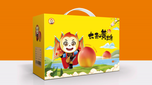 太和黄桃在自然成熟过程中,在太阳光的照射下,颜色会发生奇妙的变化,果面由黄色逐渐变为自然原果色“黄里透红”。对比全国其他产区的黄桃,因套袋的缘故,大部分都是金黄色。如何表达太和黄桃这一自然成熟、自然原色的特性,我们想到了“脸谱”。