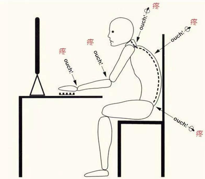 当一个人埋头认真工作的时候,TA的体型是这样的:背部弯曲,肩部下垂,而这会压迫脊柱,导致脊柱变形;