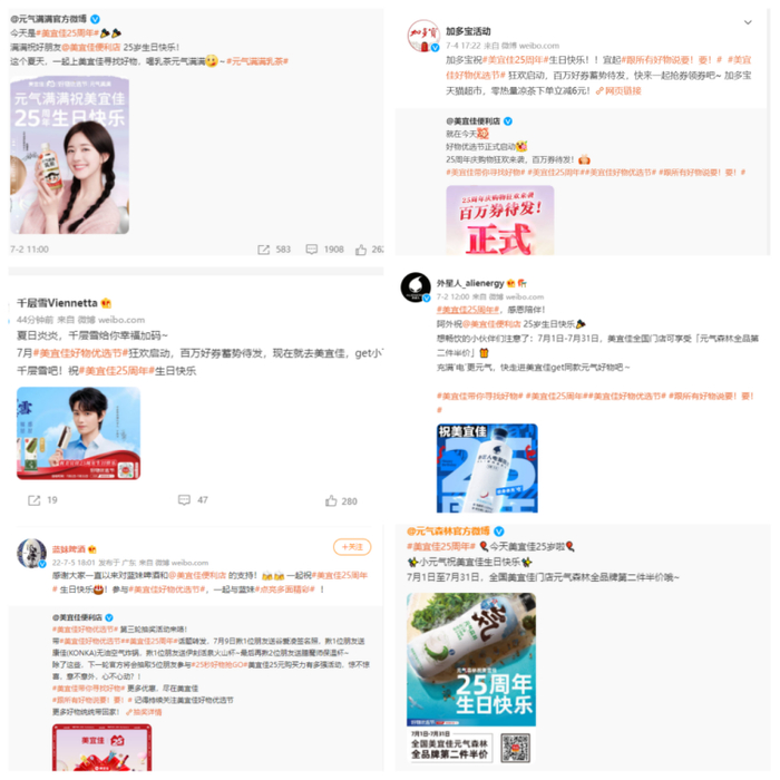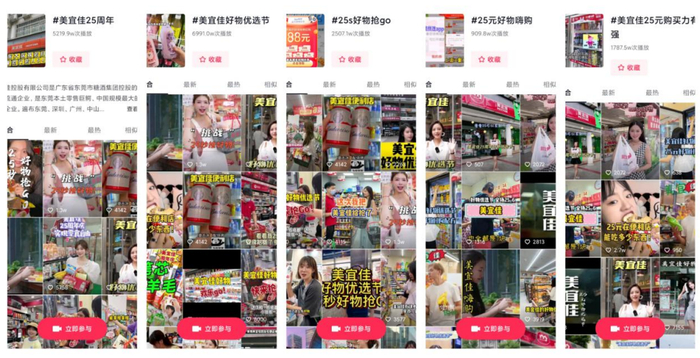 在形式上,美宜佳积极尝鲜,拥抱新鲜、酷炫、潮流的媒体形态,比如美宜佳向达人发起系列抖音挑战赛,将直播、短视频与社交网络结合,比如美宜佳接受东莞电视台邀请拍摄系列视频致敬奋斗者,再比如在微博上的话题打造,由众多品牌蓝V、达人联合转发互动,成功“破圈”。截至目前,通过抖音、微博话题聚合包括#美宜佳25周年#、#美宜佳好物优选节##美宜佳带你寻找好物##跟所有好物说要!要!##25s好物抢go##25元好物嗨购##美宜佳25元购买力有多强#在内的项目相关话题全网总播放/阅读量已突破2亿次。