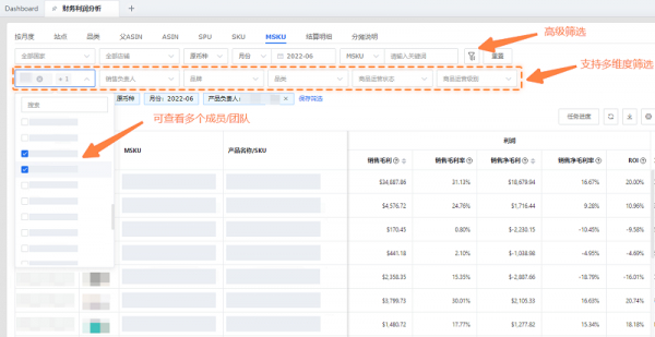 MSKU维度的【高级筛选】条件可筛选产品负责人、销售负责人、商品运营级别、商品运营状态展示列和查询条件。同时支持按照产品负责人、销售负责人,品牌,品类等创建团队,通过团队可以直接筛选查看团队汇总数据。
