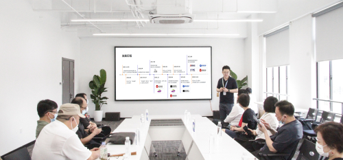 轻流创始人兼CEO薄智元在带领来访领导参观新办公楼后,向众人介绍了轻流的发展历程和详细的业务情况,解答来访领导对轻流、无代码、企业经营等提出的关切询问。