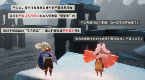 面对各类升级的诈骗手段,网易游戏代理《光·遇》在暑期重点加强了反诈宣传仪式,采用了玩家较为熟悉和容易接受的故事科普形式进行反诈教学,第七次发布“防骗小剧场”。通过场景化图文剖析诈骗流程,对平台中最新流传的“冒充官方工作室骗取玩家保证金”诈骗手段和套路进行预警,提醒玩家仔细甄别游戏内信息来源的真伪,官方不会以任何理由向玩家收取“保证金”,在面对类似情况时需时刻保持警惕。