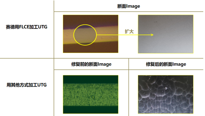 基于此,「赛德」研发了一种化学切割的方法——FLCE(Full Liquefaction Chemical Etching,纯湿制成),这种方法避免了在切割环节的物理接触,通过化学腐蚀,使得切割面在微观结构下仍然能够保持平整,无需在切割后做修复和表面处理。因此大大缩短了超薄玻璃的制成工序,良率达90%以上,而三星的同类产品良率不到90%,良率的提升为量产降低成本提供了有利条件。
