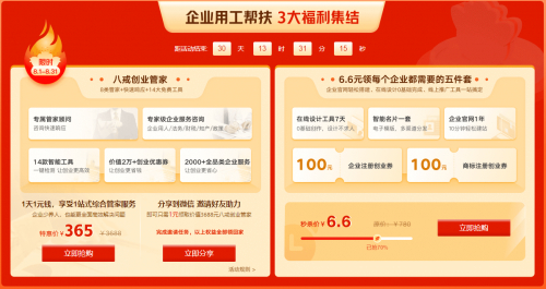 八八节活动期间,八戒创业管家将以365元的特惠价格进行促销,1天只需1元,即可获得7类管家+5分钟响应+14大免费工具。同时,购买八戒创业管家的创业者,还可获赠价值两万多元的创业优惠券。如果创业者邀请微信好友助力,还可以获得1元钱购买八戒创业管家的超级特惠资格。