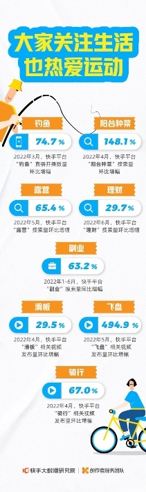 除了居家做菜,快手上半年的搜索、直播数据,也体现了人们对新的生活方式的尝试与体验。根据报告,2022年4月,“阳台种菜”搜索量环比增加148.1%;2022年5月,“飞盘”相关视频发布量环比增加494.9%。