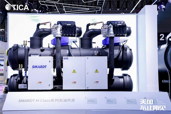 其中在全生命期成本更低展区,H-Class 系列水源热泵作为最有效的供热和制冷系统之一,可以大规模应用于兆瓦级系统,其中SMARDT的无油技术是工厂降碳计划的核心,与可再生能源整合过程中,可以最大限度地降低能源成本和GHG排放。作为微电网的一部分,该系列还可提供分散的、弹性的、降碳加热和冷却,主要应用于建筑电气化和降碳的燃气供暖节能替代方案。