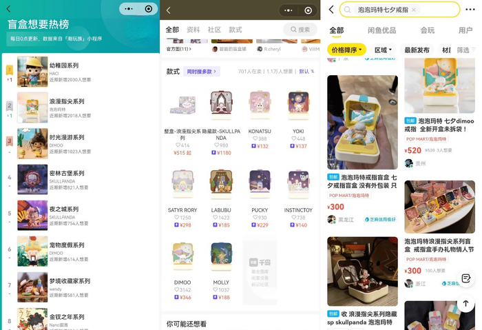 此外,在潮玩族的“盲盒想要热榜”中,泡泡玛特近期推出的新品HACIPUPU幼稚园系列、浪漫指尖系列、DIMOO时光漫游系列占据榜单前三,在前十名的榜单中,泡泡玛特的IP占据7席。在闲鱼平台,该系列单款价格也达到了100元到300元不等,据玩家反馈,“在线下门店抢到之后挂在闲鱼上,很快就有人下单买走。”