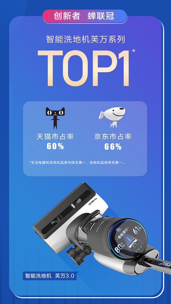 添可芙万3.0在2.0的基础上进行了全面升级,顺应市场需求变化,从增加新功能、补齐短板开始向优化用户使用体验、提升居家幸福感的方向发展,完成了产品从无到有,从有到全,从全到优的升级迭代。今年618,智能洗地机芙万系列以天猫市占率60%、京东市占率66%的绝对优势夺下洗地机品类“双冠王”,继续保持了一骑绝尘的竞争格局。