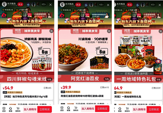 7月15日,阿宽食品旗下阿宽鲜椒勾魂米线、阿宽红油苕皮、阿宽一周地域特色礼包强势登陆东方甄选直播间,并其“爆单了”,产品一上架就被粉丝一抢而空,轻松破万单。