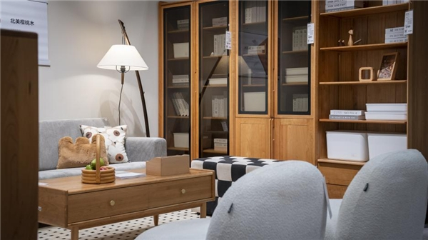 源氏木语展厅面积约500平,以材质分区,分为橡木、白蜡木、黑胡桃木、樱桃木等区域,每个区域的产品依照“客厅”、“餐桌”、“卧室”、“书房”等使用场景成套展现。消费者不仅可以真切触摸感受到不同实木材质之间的区别,领略实木家具的魅力,而且这种沉浸式的家居生活场景展示,真实还原了家庭生活环境的设置,也让消费者非常有代入感。