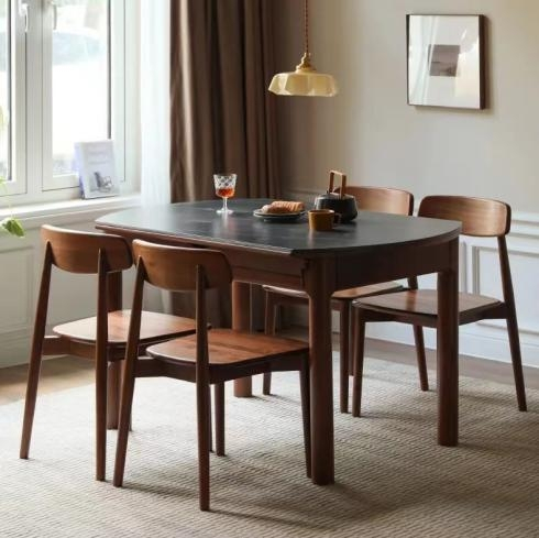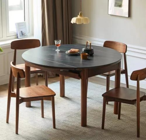 源氏木语以人性化设计为出发点,以创新设计驱动产品。展会现场展出的新品黑岩系列折叠圆桌,用北美黑胡桃木搭配黑色莎罗兰岩板,呈现出深色暗调的高级质感,加上可折叠变化的炫酷属性,可变圆桌、半圆桌、椭圆桌三种造型,能够满足不同人数的用餐需求。