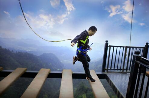 荡绳虽然惊险无二,但是每年能玩的时间就那几天,每天能玩的人就那几十个,无法满足高空项目爱好者的“日常需求”。今年夏天,奥陶纪推出了依托于吉尼斯世界纪录的天空悬廊的“天空蹦极”,也就是在天空悬廊的顶端起跳,下面是300米的悬崖,一下子把蹦极这个项目拉到了全新的恐惧度上去了,和国内最著名的坝陵河大桥蹦极、矮寨大桥蹦极、澳门塔蹦极和张家界玻璃桥蹦极一样,成为了高空项目控们的必打卡项目,这种项目,也是很难模仿的。