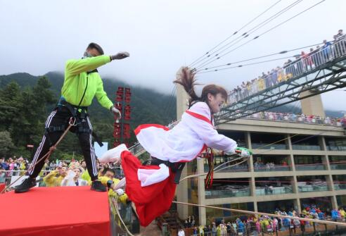 无法模仿的悬崖项目,此前几年,奥陶纪是牢牢依托着天空悬廊做文章,每年盛夏的“极限荡绳节”,把高空项目最惊险的无弹力的荡绳引进过来,起跳点就在天空悬廊上,这个项目的刺激程度在国内可谓独一无二,所以每年都吸引了高空爱好者来挑战,去年奥陶纪放出了几个近万元的报名名额,结果都被一抢而空,可见这个项目的魔力,当然这也成为了抖音上的爆款,单一项目的流量也以十亿计。