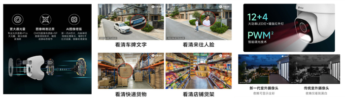 除了像素升级,该机充分考虑夜间看家看店的安防需求,给夜间看护带来高清全彩画面体验。摄像头采用了PWM智能调光技术,在光线较暗、环境且正常时该设备将自动默认为黑白夜视。当检测到有人出现时,该设备将会自动打开12颗大功率LED灯自动补光,显示彩色画面,让夜间看护变得更加清晰多彩。