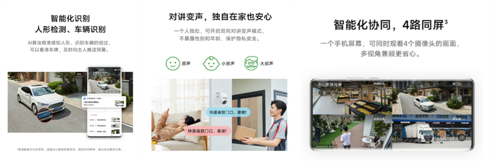 作为一款安防产品,其多场景、多重防护的功能,可以让该摄像头在看家、看店、看宠物等场景中发挥更大作用。在AI智慧侦测方面,该产品可以实现AI人形监测、车辆移动监测、全景移动追踪,可以通过AI算法精准感知人形、识别车辆的经过,甚至可以看清车牌号,如果有突发情况能及时向主人推送预警。全新的4路同屏功能,可同时观看4个摄像头的画面,多视角兼顾不放过任何一个细节。另外,小豚当家室外摄像头新品还增加了独特的对讲变声功能,一个独居,开启对讲变声功能,不暴露性别和年龄,更安全。