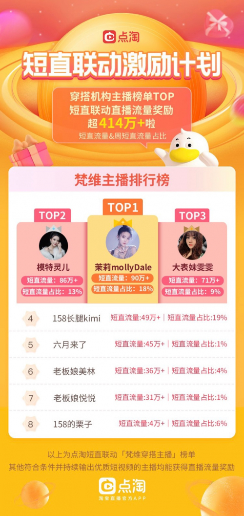 同时,梵维机构短视频负责人还提到,点淘短视频给机构和主播带来了各个方面的收获:在流量方面,短视频账号能够精准地把服装偏好的短视频流量,引入直播间;在主播宣传推广方面,主播可以借助参加点淘的视频打榜赛、定向视频约稿,获得更多资源位的曝光;在粉丝互动方面,规律地发布风格统一、制作精良的穿搭视频,有利于增加粉丝黏性,在不开播时段也能吸引粉丝的持续关注。