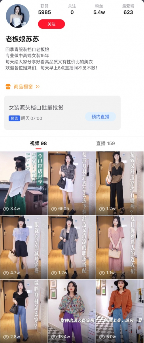 老板娘苏苏以及四季青机构就抓住了这个机会。实际上,经过点淘小二和短视频服务商的分析策划,四季青机构的主播具有非常鲜明的主播人设。负责人坦言,四季青的主播都在四季青开店多年,对服装的面料、款式、搭配都了如指掌,因此主要以“工厂老板娘”、“档口老板娘”的人设来打造主播短视频账号。