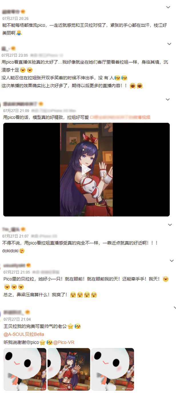在A-SOUL官宣7月27日晚上20点贝拉将在PICO进行直播的时候,获得了粉丝们一致欢迎,不少人表示期待,“能不能提前点直播啊?好期待”、“已经等不及那一天了”......这种评论刷屏,可见粉丝们对于贝拉降临PICO的期待。