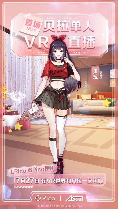 在前段时间,A-SOUL与PICO展开深入合作,让粉丝能够更轻松与A-SOUL互动,就在7月27日晚上八点,贝拉本人更是直接降临PICO,进行第二场VR直播,让粉丝们身临其境与贝拉共舞。