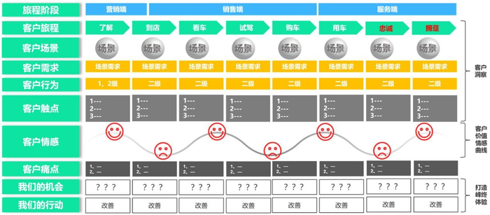 卓思将汽车行业的客户体验旅程地图分为客户洞察、绘制客户价值情感曲线以及打造峰终体验三大步骤,其完整架构由旅程阶段、客户旅程、客户场景、客户需求、客户行为、客户触点、客户情感、客户痛点等十个要素构成。