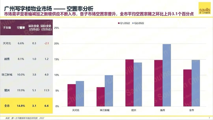 近日,广州写字楼空置率的话题倍受关注。根据五大行之一世邦魏理仕发布的《2022年上半年广州房地产市场回顾与展望》,今年上半年广州写字楼租赁市场颇为冷淡。第二季度末,广州的写字楼空置率攀升至14%,乃是五年来首次突破10%。第一太平戴维斯7月发布的数据同样显示出市场形势的严峻:今年第二季度全市净吸纳量为-2.6万平方米,这是广州近十年来写字楼近吸纳量的最低值。