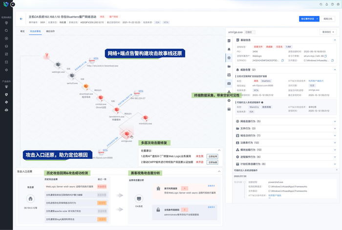16分钟后,通过可视化进程链溯源快速定位,深信服安全专家锁定攻击入口是某OA软件的漏洞。