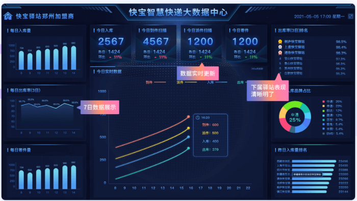 快宝智慧大屏实时展示到、派、签、入库、出库、寄件数据,业务波动一目了然,还有暴跌预警、暴涨监控,让网点及时发现问题并解决问题,减少不必要的损失。