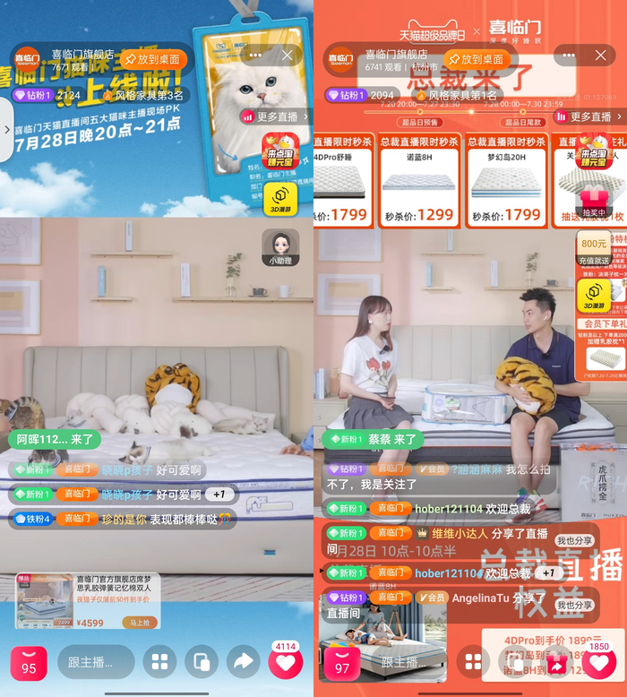 与品牌TVC相呼应的,还有萌宠花式直播,喜临门天猫超级品牌日通过以猫咪为主播的趣味直播带货方式,激发年轻用户参与互动,在大众消费者中收获广泛好感与关注;还有品牌总裁携多款单品BOSS折扣空降直播间,不间断派送宠粉惊喜,最终猫咪、总裁两大主题直播销售同比日销提升280%。