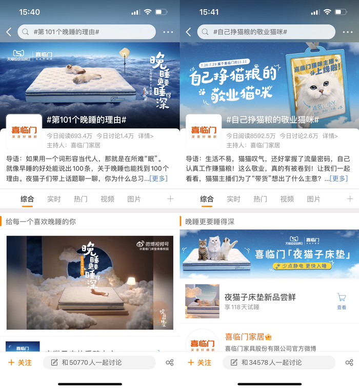 活动首发的创意TVC《致所有夜猫子们》,将不同晚睡人群比喻为各种类型的“夜猫子”,通过典型的生活场景与萌宠趣味演绎,引发年轻人的共鸣,成功建立“晚睡更要睡得深”的心智,获得近2128万曝光量,互动量近5.2万。同期的微博话题#第101个晚睡的理由#在线上征集广大年轻用户参与,分享个人生活中不得不晚睡的那些原因,最终有多个热门话题登上微博热搜,总计阅读量破4亿,互动量破8万。