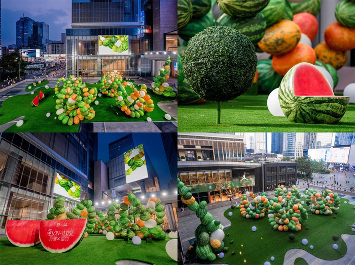 “the MELON-VERSE万有xi引力”沉浸式互动艺术展分为“The Maze”和“The Garden”两部分。位于成都IFS一层古迹广场的“The Maze”形态奇妙,由轻薄气模材质制作而成的巨型西瓜,仿佛插上了梦幻之翼即将奔赴蓝天,轻盈活泼的姿态散发出强大的吸引力,呼唤观者摆脱束缚,一同活力向上。一旦走进装置中,观者将沉浸在反复感受迷失和探索的过程里,就像经历了一次独特而亲密的体验旅程,犹如数位世界中信息的来回流动,真实和虚构共存,探寻与惊喜反复,仿似“迷宫”探险。