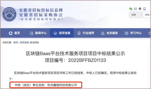 近日,安徽省招标投标信息网站公开信息显示,合肥市大数据资产运营有限公司“区块链BaaS平台技术服务项目”招标结果正式公布,杭州趣链科技有限公司成功中标,同期竞标的还有蚂蚁链、云象等多家企业。趣链科技表示,后续将秉持求真务实的态度,以国产自主可控的区块链技术为合肥市搭建区块链BaaS平台,提供便捷的一键式部署服务和安全的开放服务环境,降低区块链应用开发难度,有效推进区块链和实体经济的深度融合,为合肥市营造区块链产业生态,促进合肥市乃至安徽省社会经济高质量发展。