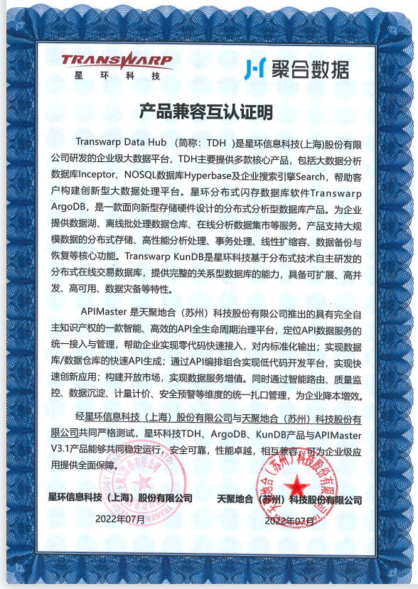 此次与星环科技完成产品兼容性适配认证,是聚合数据产品实力的体现,充分表明聚合数据API全生命周期管理工具APIMaster的高适配性、高成熟度和高稳定性,以及对国产适配的快速响应能力。与星环科技完成产品兼容性适配认证后,APIMaster的业务领域也将向金融、能源、交通、政务、制造等方向拓展,助力相关企业实现数据敏捷共享、数据资产开放 ,盘活数据资产、释放数据红利。