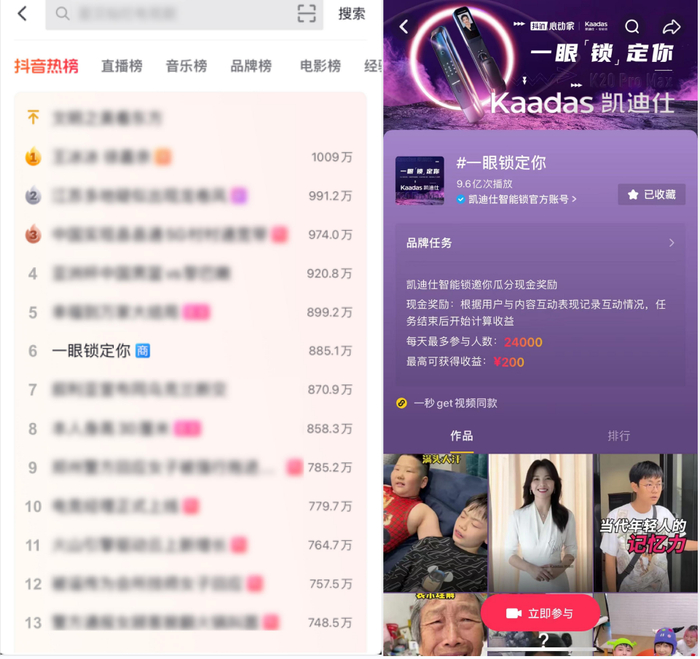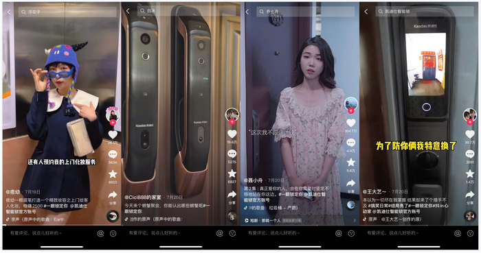 随后,@刘大悦 、@云吞它爹 、@聂小舟 、@陆仙人 @末那大叔、 @魔女月野、 @遇见她* 、@小麦、@这是TA的故事 、@大能 、@糯米的趣味生活、 @南翔不爱吃饭、 @一栗小莎子、@王大艺~、 @天天的一天到晚 、@小刚学长、@Cici888的家宴等众多万级达人,纷纷加入,用有趣有梗的创意内容讲述他们与凯迪仕“千里眼”智能锁的故事。截至目前,凯迪仕抖音话题#一眼锁定你#共吸引了近10万名用户参与,相关话题播放比较终突破了9.6亿次。